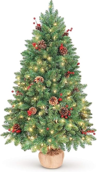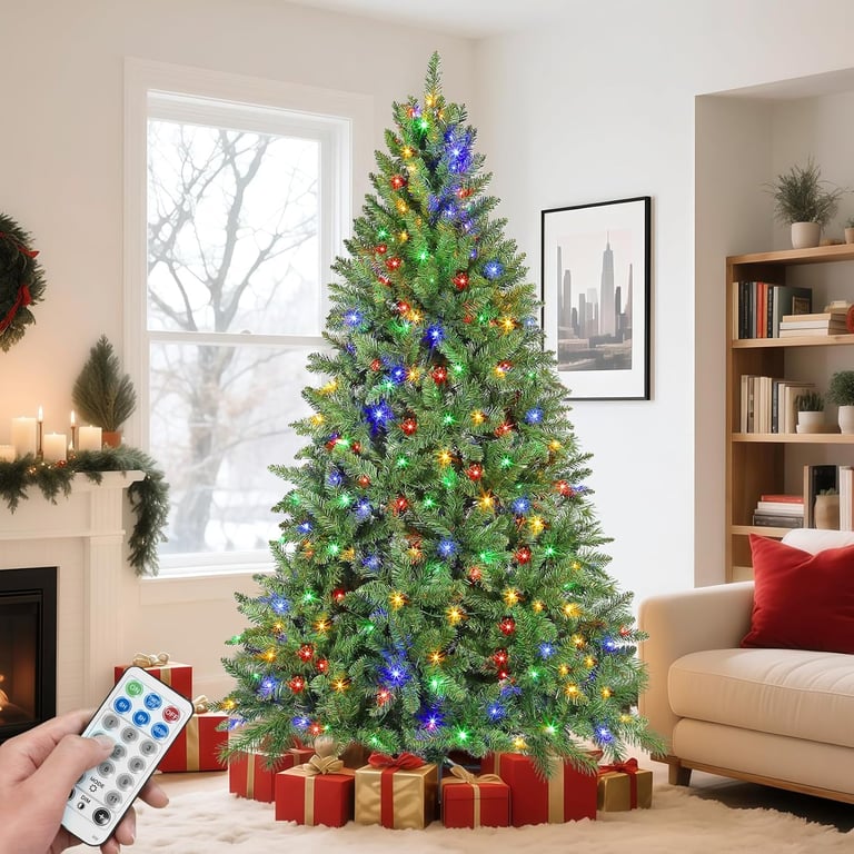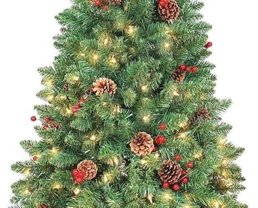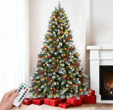 Pre-lit Artificial Christmas Tree with Remote, 847 Branch Tips, 300 Lights, 52 Pine Cones, 52 Red Berries,