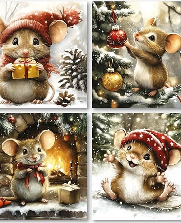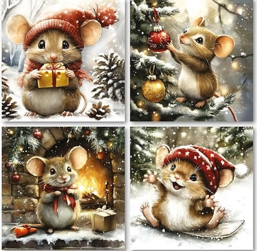Charity Christmas Cards Pack of 32. Each Christmas Card multipack has 4 different Festive Mice designs. Ecofriendly and UK made. Verse Inside. Small 100 x 100mm card size.
