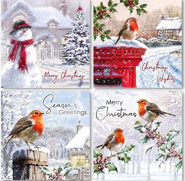 Christmas Cards Pack of 24 | Each Christmas Greeting Card multipack has 4 different Xmas Robin designs Snowmans Ecofriendly and UK made