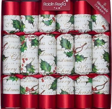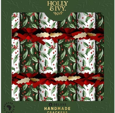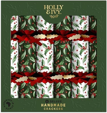 Holly and Ivy Deluxe Handmade Christmas Crackers – Joyful Winter Foliage Design – Luxury 12 Inch Crackers with Hats, Jokes & Gifts – Box of 6