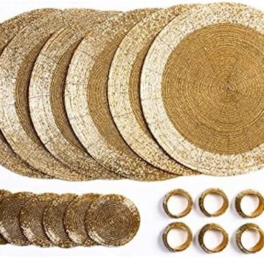 Penguin Home Handcrafted Glass Beaded Round Placemats, Coasters & Napkin Rings Set of 18 - Handmade Table Place Mats for Dining - 32 cm (13") Diameter (Gold) For 6 people Colour Options 12 Also for 4 people (12 Pieces)